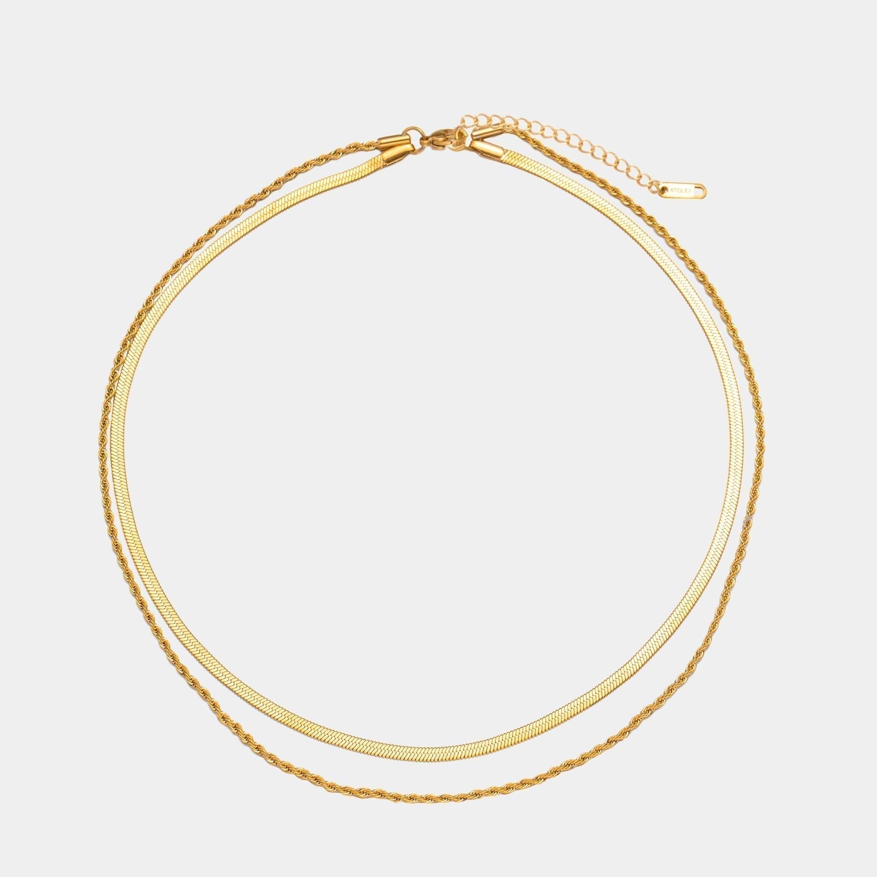 Ce collier présente un design à deux chaînes, composé d’un choker plat et d’une chaîne torsadée moyenne. Il est conçu pour être porté seul ou associé à d’autres accessoires. Sa longueur ajustable permet un positionnement confortable selon le style souhaité.