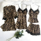 Cet ensemble de nuit quatre-pièces comprend un kimono, une camisole, un short et une chemise de nuit assortis. Le design à imprimé léopard offre une apparence coordonnée et distinctive. Convient pour la maison et les moments de repos.