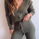 Cet ensemble comprend un haut à manches longues avec col en V et un pantalon taille haute. Il est conçu pour un usage quotidien, à la maison ou à l’extérieur. Le design uni et coordonné permet une tenue simple et fonctionnelle.