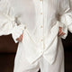 Cet ensemble deux pièces comprend un haut à manches longues avec col en V et détails à volants, accompagné d’un pantalon assorti. Le haut est doté d’une fermeture boutonnée pour plus de praticité. L’ensemble est conçu sans élasticité, offrant une coupe simple et structurée.