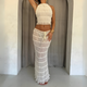 Cet ensemble comprend un haut court à col halter et une jupe longue à taille élastique. Le haut se noue dans le cou et laisse le dos dégagé. La coupe ample de la jupe permet une utilisation dans des contextes variés.