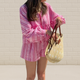 Cet ensemble comprend une blouse ample ornée de volants et un short assorti avec taille élastique. Le motif rayé recouvre l’ensemble des deux pièces. Disponible en rose et vert, tailles du S au XL.