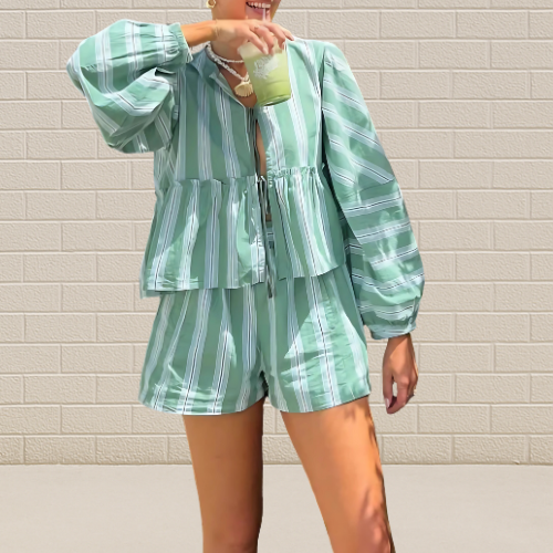 Ensemble Rayé Deux Pièces avec Blouse à Volants et Short pour Femme | Idéal pour l'Été Décontracté