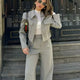 Cet ensemble se compose d’une veste courte à manches longues et d’un pantalon large taille haute. La coupe coordonnée permet de créer une tenue adaptée aux environnements professionnels comme aux moments de détente. Les deux pièces peuvent être portées ensemble ou séparément selon l’occasion.