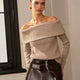Pull à encolure large conçu pour être porté avec les épaules découvertes. La structure en maille fine permet une utilisation pendant les saisons modérées. La coupe est près du corps et adaptée à un usage quotidien ou occasionnel.