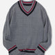 Ce pull-over pour homme présente une maille structurée avec un col en V contrasté. Il est conçu avec des bords rayés sur le col, les poignets et l’ourlet pour un effet visuel distinct. Sa coupe standard permet une utilisation régulière dans différents contextes.