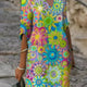 Cette robe à fleurs est conçue pour un usage quotidien ou pour les activités de plein air pendant les saisons chaudes. Elle comprend une encolure en V et des manches courtes avec une coupe droite. La robe tombe au-dessus du genou et est disponible en plusieurs tailles.