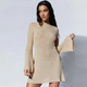 Cette robe courte est conçue pour être portée pendant la saison automnale. Elle présente une encolure bateau, des manches longues évasées et un dos à nouer. Sa coupe mini offre une tenue adaptée pour diverses occasions décontractées ou habillées.