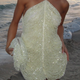 Cette robe courte est conçue pour être portée lors d’événements festifs ou de sorties en soirée. Elle présente une encolure américaine et une coupe ajustée qui met en valeur la silhouette. Les détails perlés ajoutent une finition décorative adaptée aux occasions habillées.