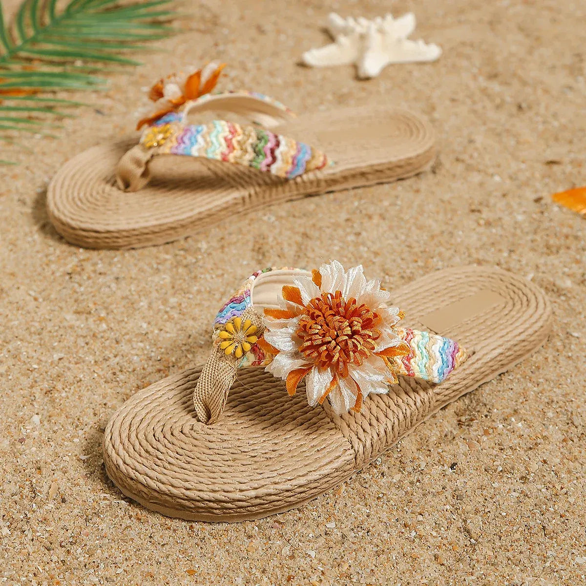 Sandales plates dotées d'applications florales décoratives, conçues pour une utilisation quotidienne par temps chaud. Le design comprend une semelle tressée de style espadrille et des brides ornées de fleurs texturées. Adaptées aux sorties estivales en extérieur.