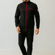 Ce survêtement deux pièces comprend une veste zippée avec col montant et un pantalon assorti. La veste est conçue avec une fermeture haute, tandis que le pantalon est ajusté au niveau des chevilles. Des détails contrastés ajoutent une touche visuelle à l’ensemble.